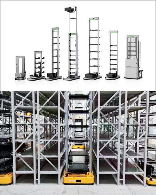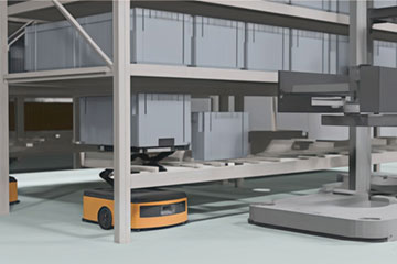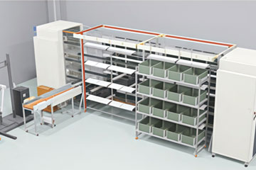 MiniAGVが高層ラックの最下段までバケットを搬送し、ACRが保管間口へ棚入れします。出庫時は引き当てられたバケットをACRが最下段に置き、MiniAGVがピッキングエリアに搬送します。