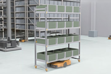 AMRが顧客・店舗・方面別などに仕分けられたバケットの入った中量ラックを、梱包エリアに搬送します。