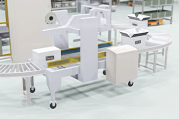 梱包エリアで商品の箱詰めを行い封緘機にて段ボールを封緘し、パレタイズエリアまでコンベアで搬送します。