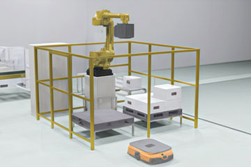 封緘された段ボールをパレタイズロボットでパレットにティーチレスで積み付けます。
