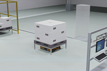段ボールが積み付けられたパレットをAMRで搬送しながらPhoxter製画像処理コントローラStellaController 2.0で出荷検品を行います。